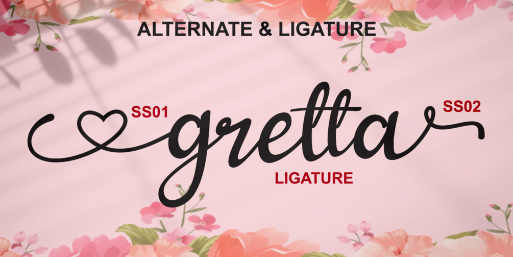 This font includes over 256 glyphs, including over 57 alternate characters with swashes.