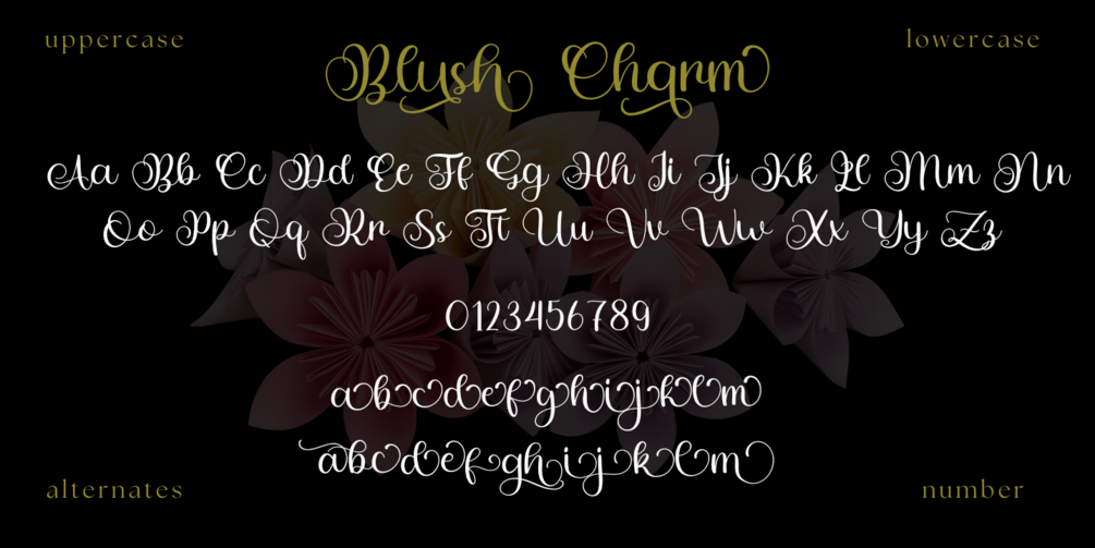 Designed with versatility in mind, Blush Charm includes a complete set of uppercase and lowercase letters, numbers, punctuation, and an array of exquisite swashes and alternates, giving you endless creative possibilities.
